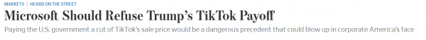 “微软应该拒绝向特朗普支付报酬”,美国《华尔街日报》8月3日以此为题发出疾呼,称如果抽成的提议是认真的,并被认为是合法的,那就将立下一个“危险先例”,并为美国企业遭受同样的待遇打开大门。
