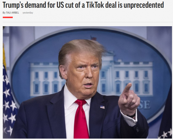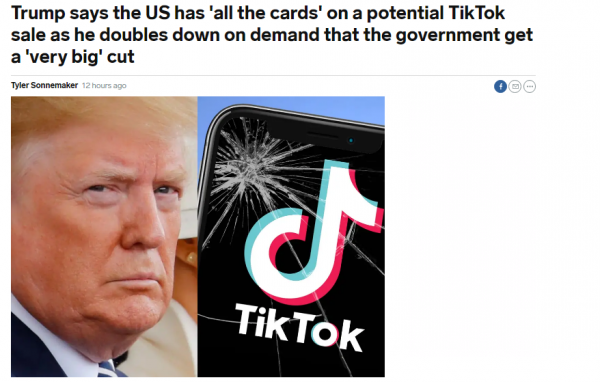 美国总统特朗普再次语出惊人,称在对TikTok部分国家业务的收购案中,美国政府应该在交易中分一杯羹。