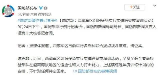 据媒体报道,西藏军区日前举行多兵种联合拔点战斗演练。请证实。