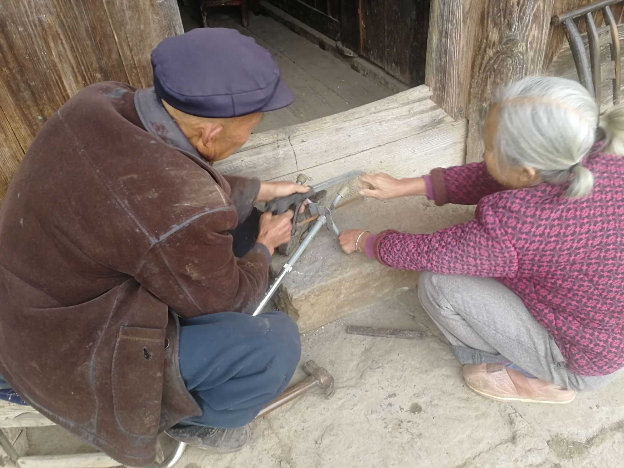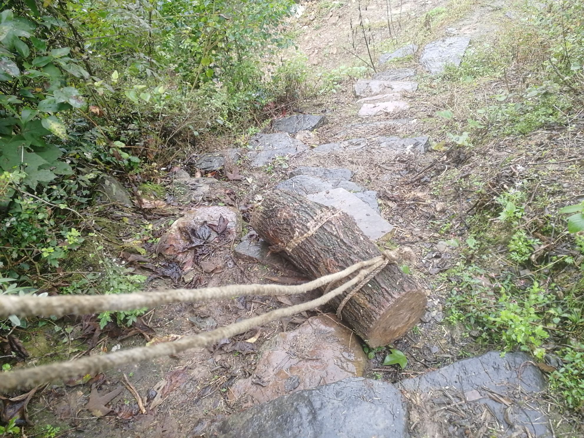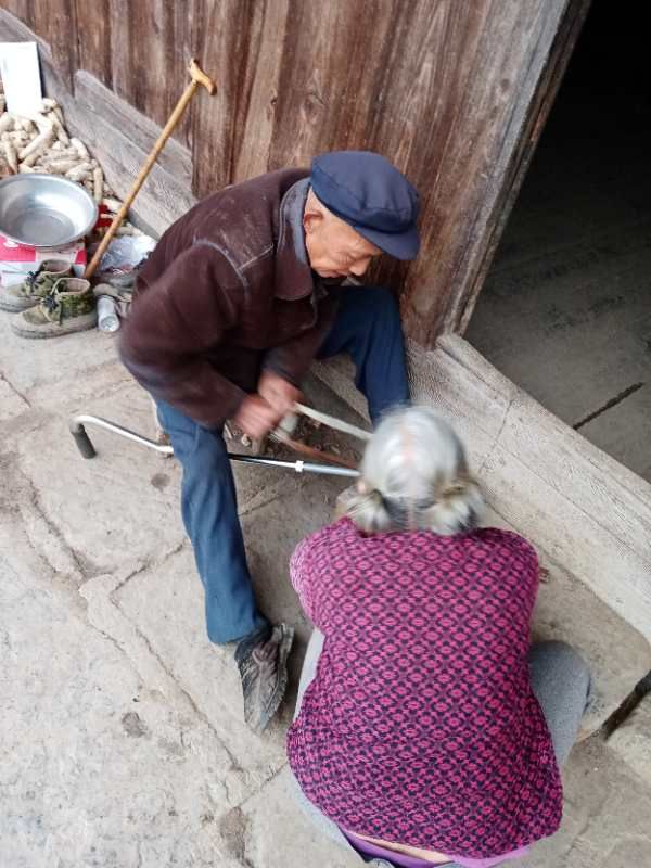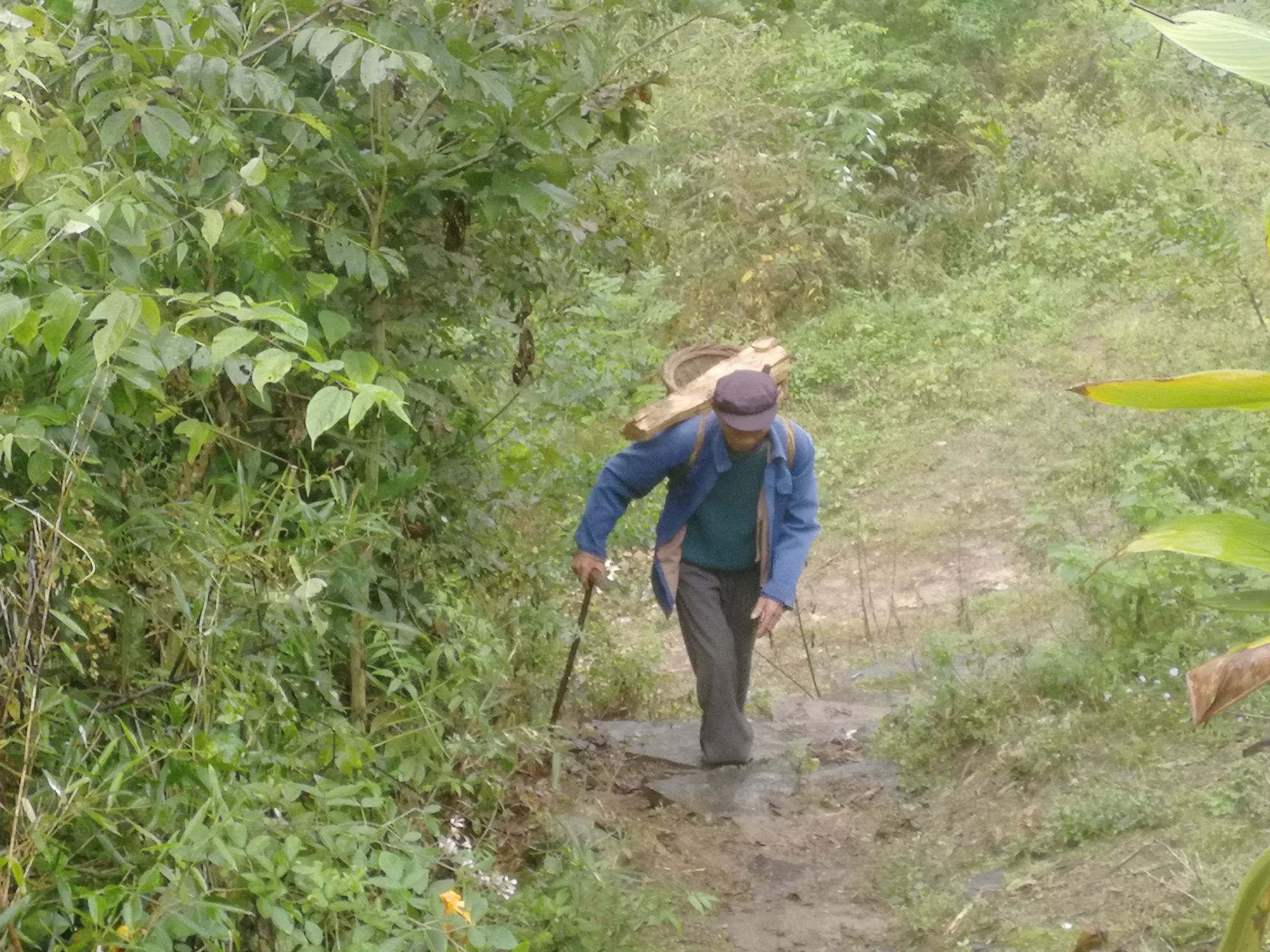 连走路都要拄着拐杖,才能艰难地一步一步向前挪。看见了吗,吃力地背着一块劈渣块。