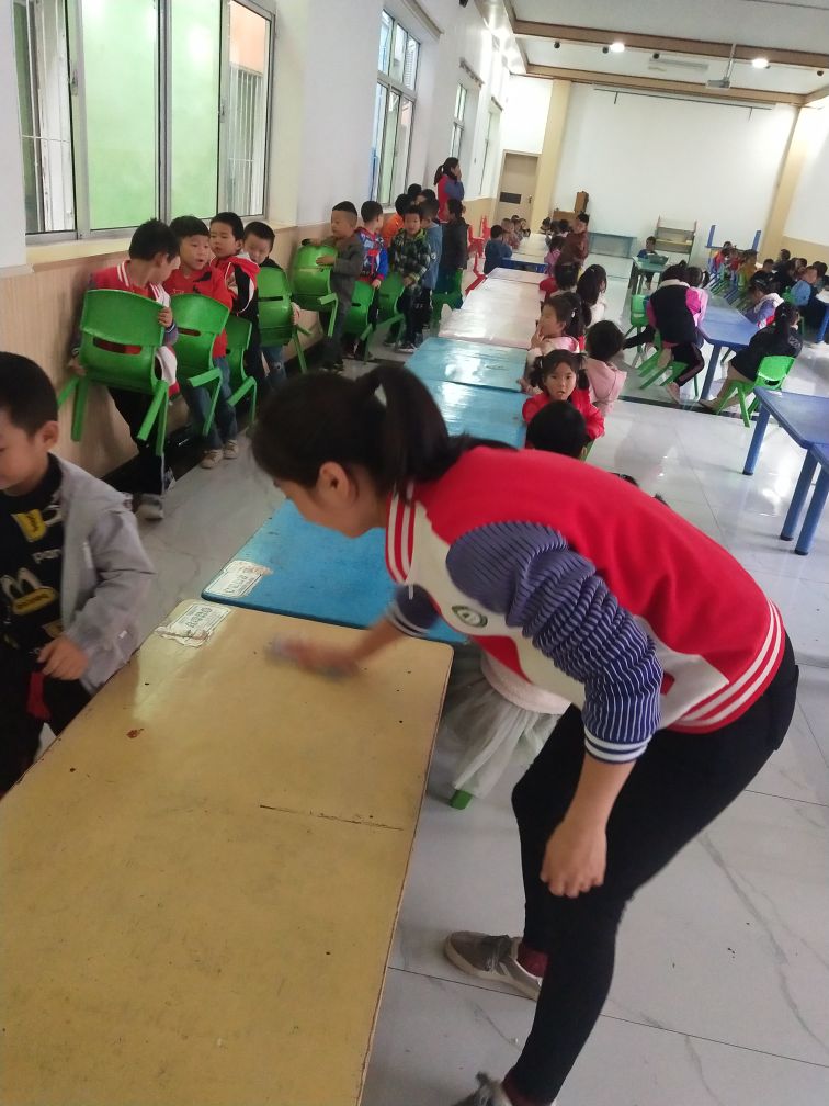饭后就是老师们的清洁工作,为孩子们营造一个温馨舒适的就餐环境