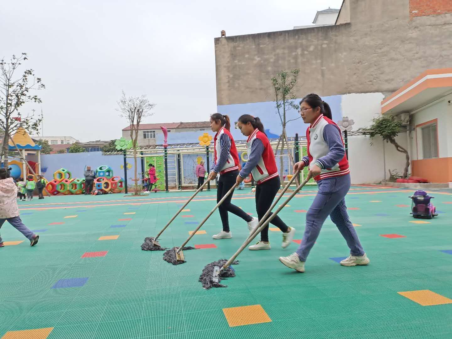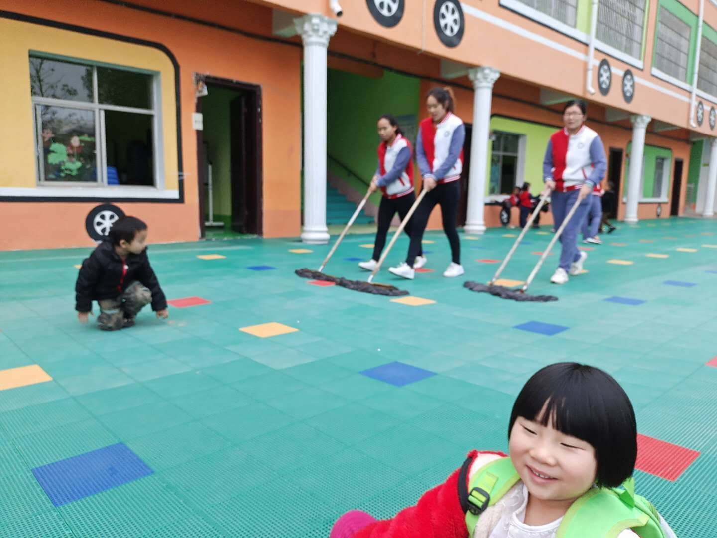 放学啦,老师们开始清洁外面的大操场,保证校园干净,给孩子们营造干净的户外活动场地和没有异味的厕所