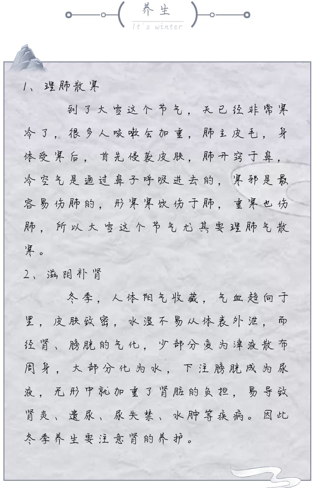 冬季寒冷干燥,幼儿皮肤中的水分散失较多,皮脂腺分泌较少,皮肤容易出现干裂发痒,要让幼儿多吃蔬菜、水果,多喝开水,并常用热水洗手、脚、脸,再适当搽点护肤霜。