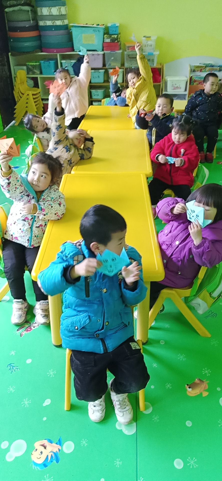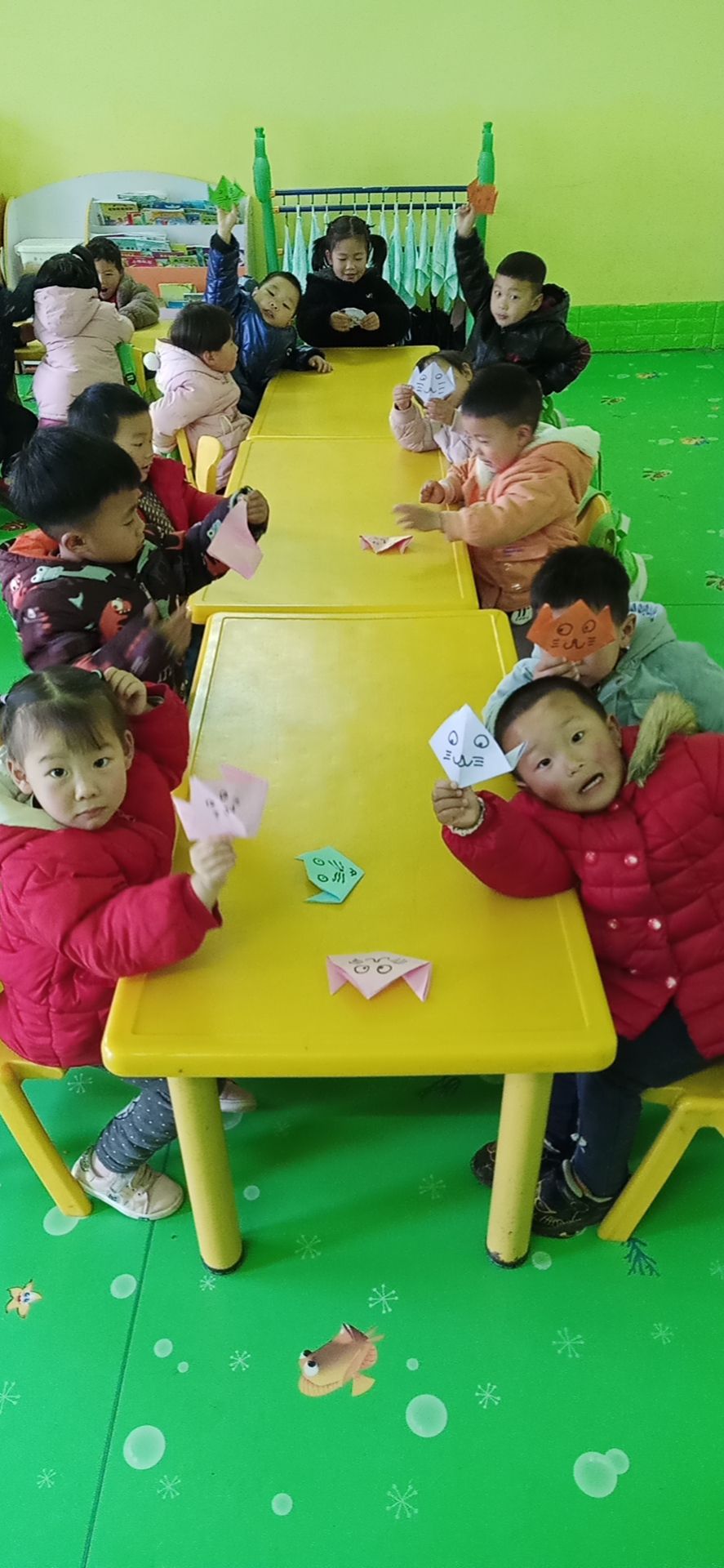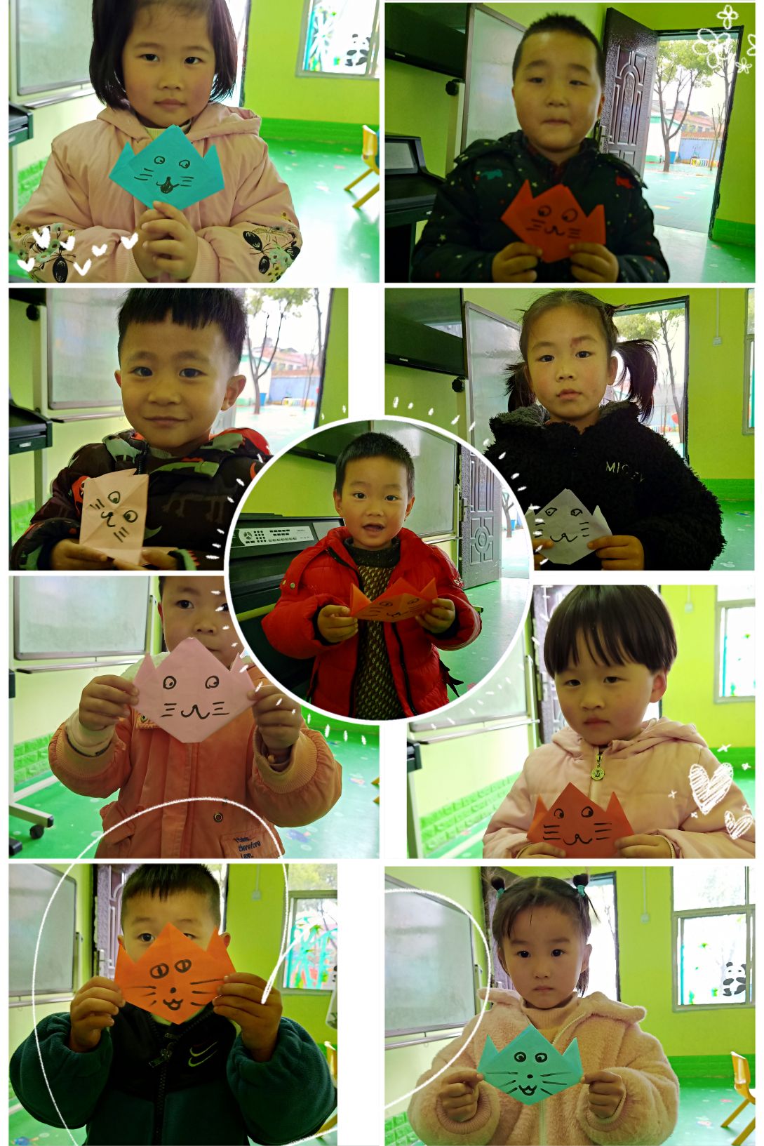 手指游戏后,手工课折纸开启,开发幼儿大脑想象力,我是一只小花猫,喵喵喵。