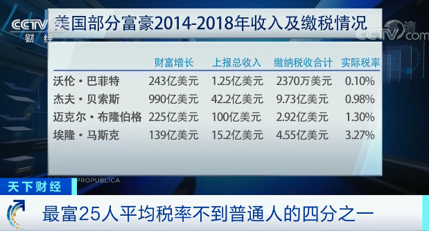 总体上来看,在2014年至2018年这5年间,福布斯统计的美国最富裕的25人的财富总额增长了4010亿美元,但他们只支付了136亿美元的联邦收入税,