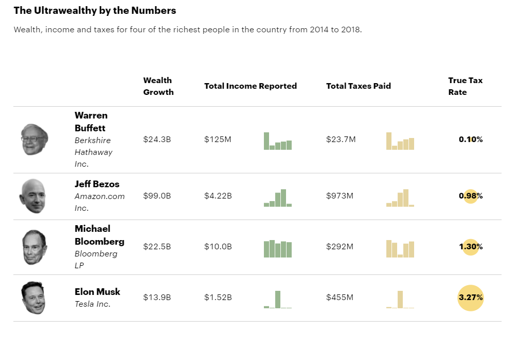 比如,亚马逊创始人、现在的世界首富贝索斯从2014年到2018年报告的收入为42.2亿美元,缴纳的税款为9.73亿美元,但考虑到其身家暴涨至近千亿美元,实际税率不到1%。