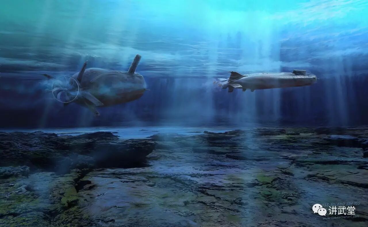 美军海狼级攻击核潜艇追踪苏联奥斯卡级巡航导弹核潜艇的想象图,实际双方跟踪距离会保持在1000米左右,比图上距离大2-3倍。