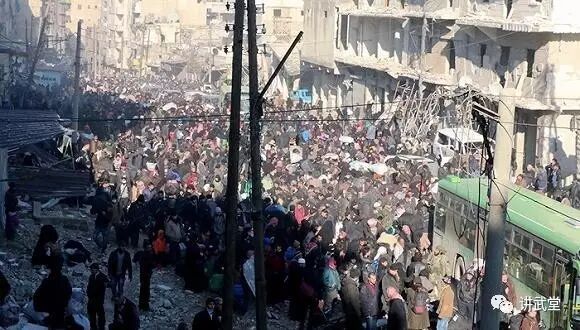 准备登车的阿勒颇武装分子,可见大多是青壮年男性,正是百战余生的主力军,撤离阿勒颇后可以换个地方继续作战。