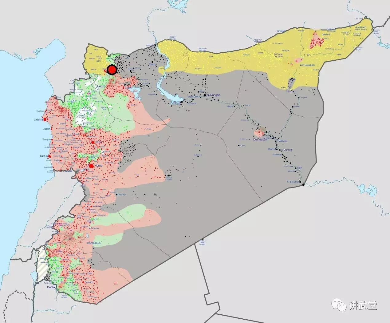 今年中的叙利亚局势图,图片上方黑边红点就是阿勒颇。虽然该城的问题暂时解决,但地中海东部周围仍然是充满矛盾的火药桶,未来必然持续爆发战争。