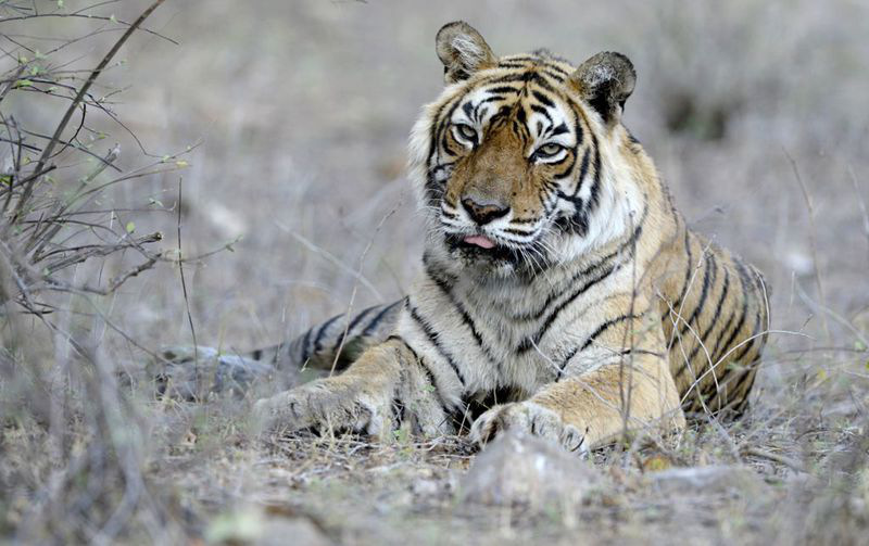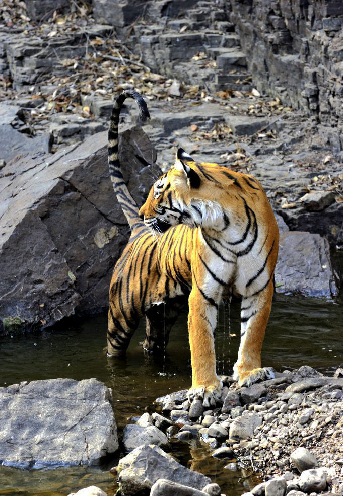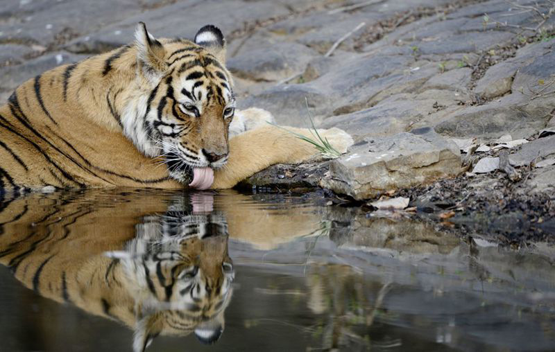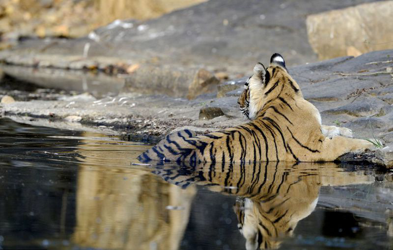 2016年8月19日,印度拉贾斯坦邦国家公园,老虎Machali在自己的栖息地。世界上寿命最长的老虎、20岁的Machali在拉贾斯坦邦国家公园死亡。因为它的面部特征,它被命名为Machali,在印度语中是鱼的意思。