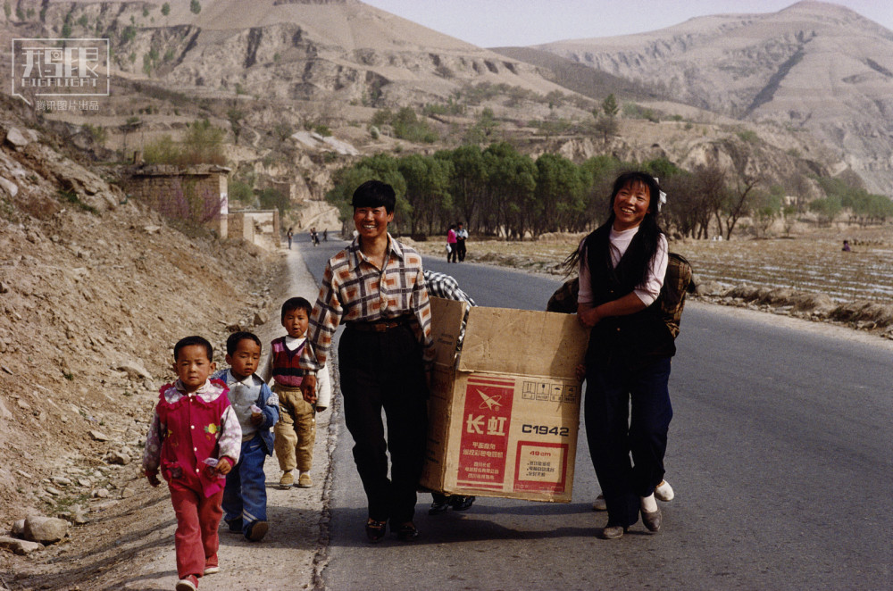 1998年,陕西,延安附近村民搬运一台新买的电视机。