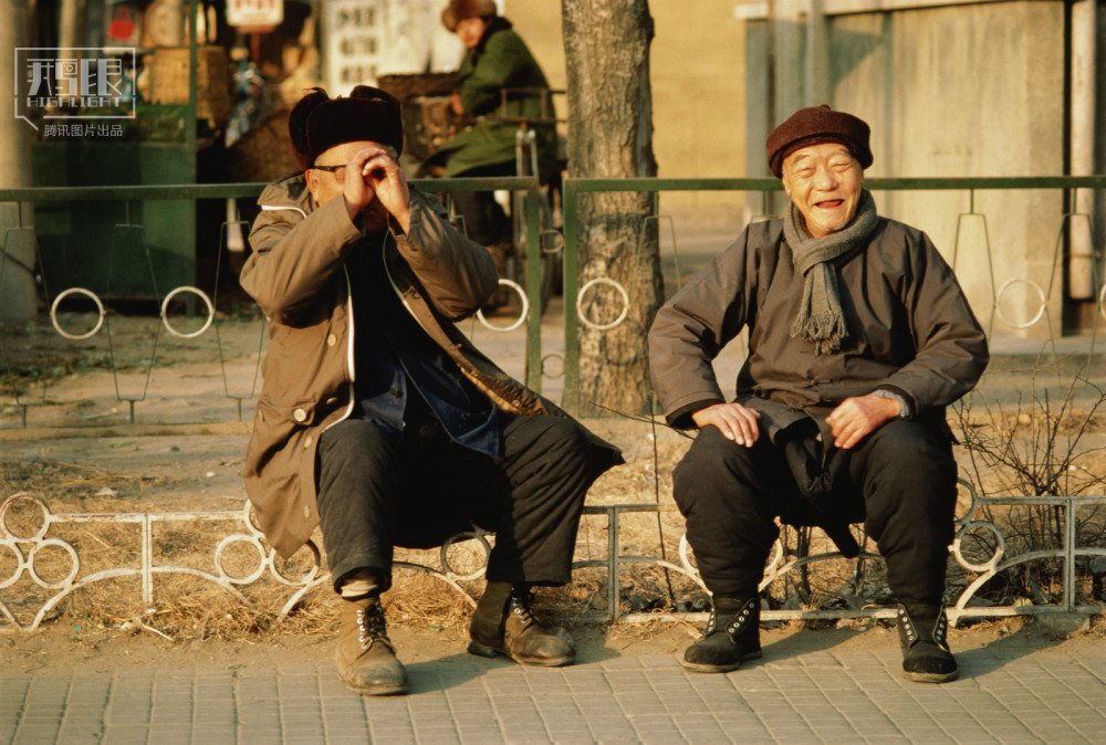 1986年,北京,两位坐在户外的老人。一位老人还穿着对襟棉袄和大棉裤。