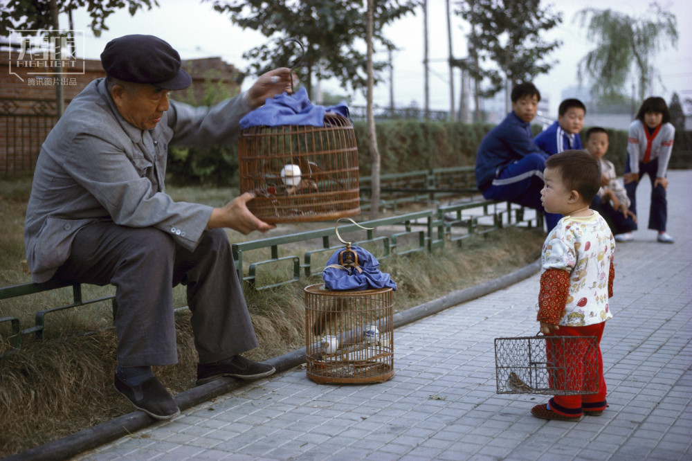 1986年,北京,一位老人向小朋友展示他的鸟笼。“提笼架鸟”是正宗的皇城根儿文化,也是老北京市井文化的标志之一。