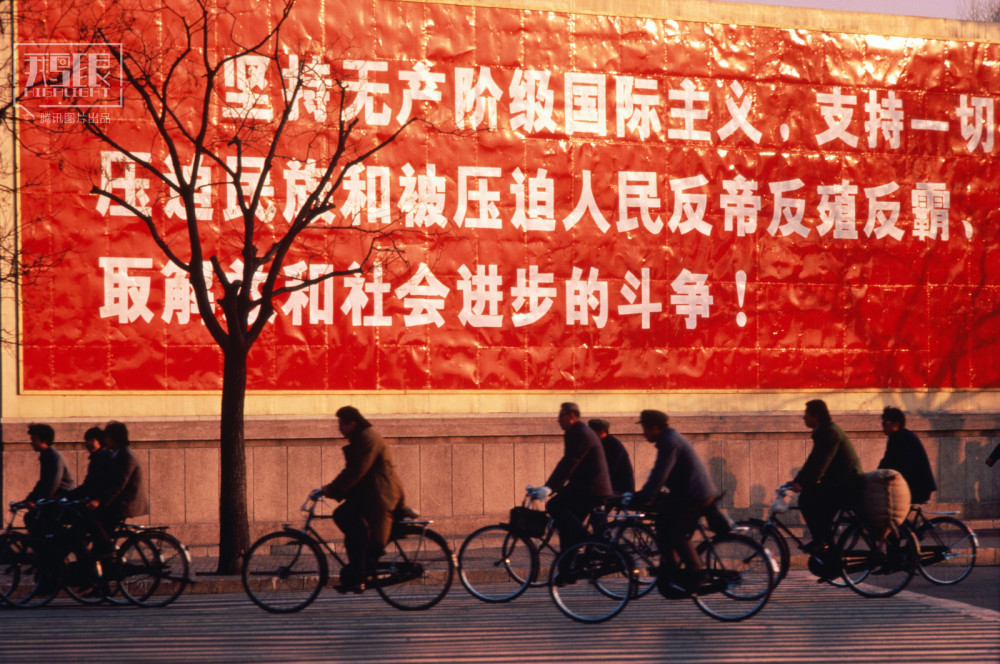 1985年,北京,长安街,人们骑车经过一串政治标语。
