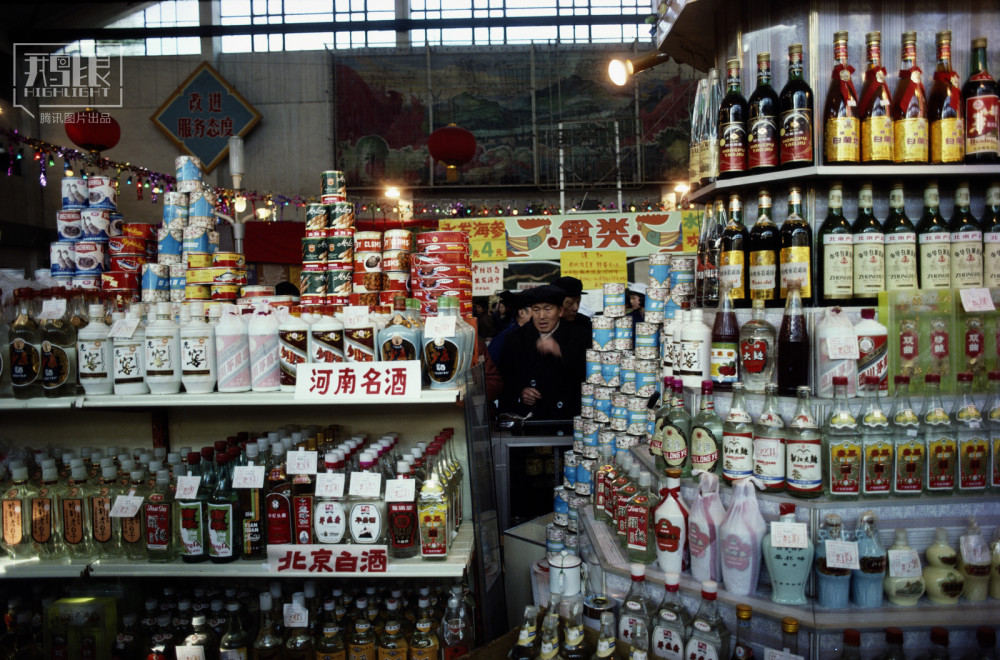 1986年,北京,王府井百货商店烟酒柜台,荟萃了全国各地的名酒。