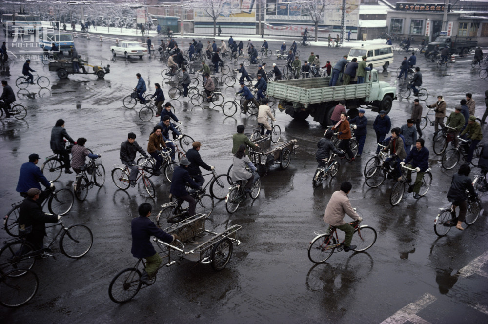 1985年,辽宁沈阳,人们骑车经过繁忙的路口。