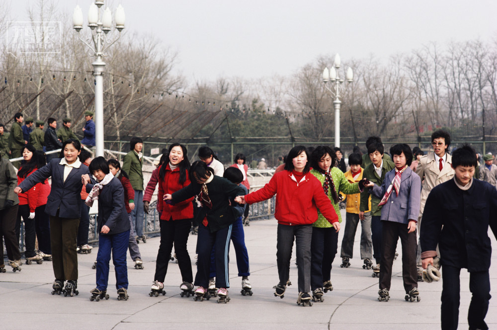 1985年,辽宁沈阳,人们在户外滑旱冰。这种旱冰鞋需要用布带绑在鞋上,滑得时候“滋遛滋遛“作响。