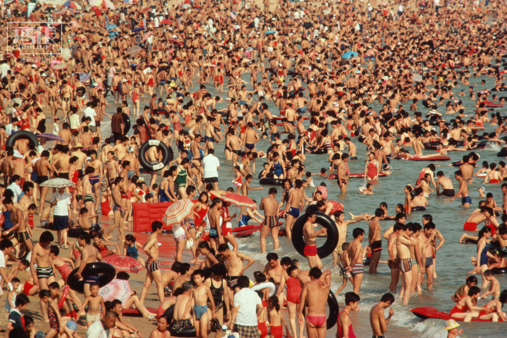1987年,青岛,拥挤的海滩。
