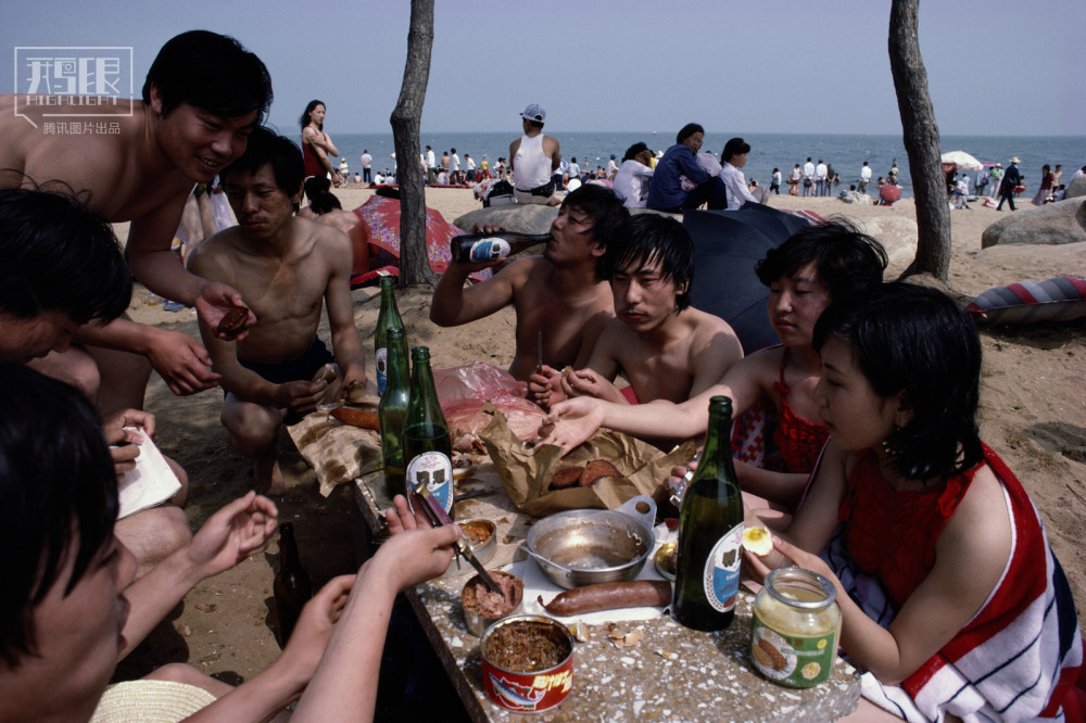 1987年,河北北戴河,海滩吃东西的游客。