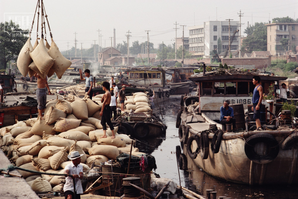 1991年,山东,京杭大运河济宁段,码头上忙碌的船工。