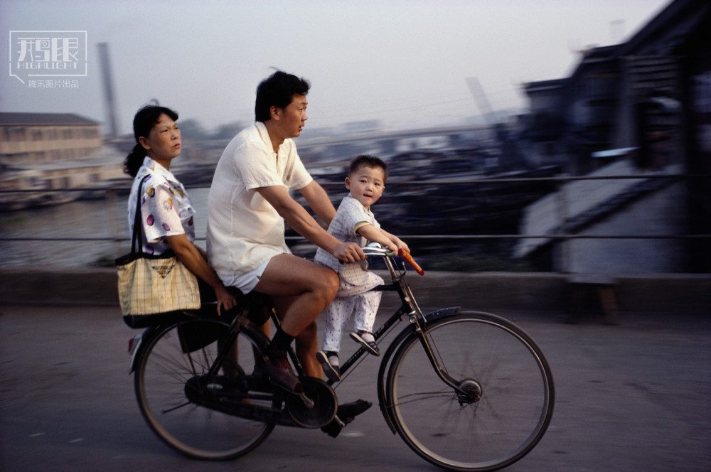 1991年,江苏苏州,一家人骑车经过京杭大运河上的桥。那个年代出行,一辆二八自行车,男的蹬车,小孩坐大梁,女的坐后座,一家三口出行全搞定。
