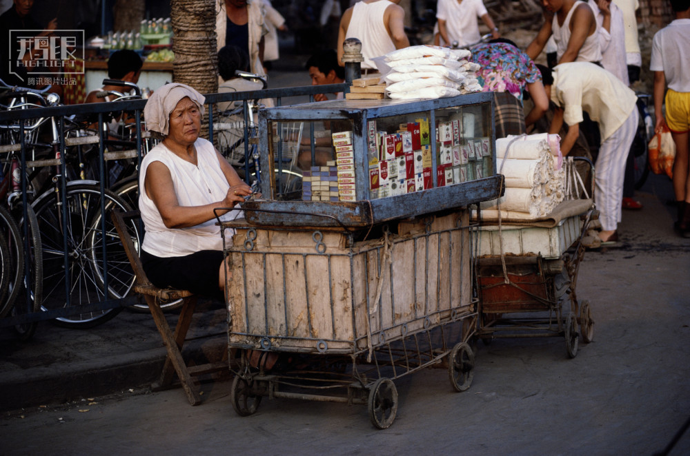 1987年,河南郑州,街头卖烟的老太太。
