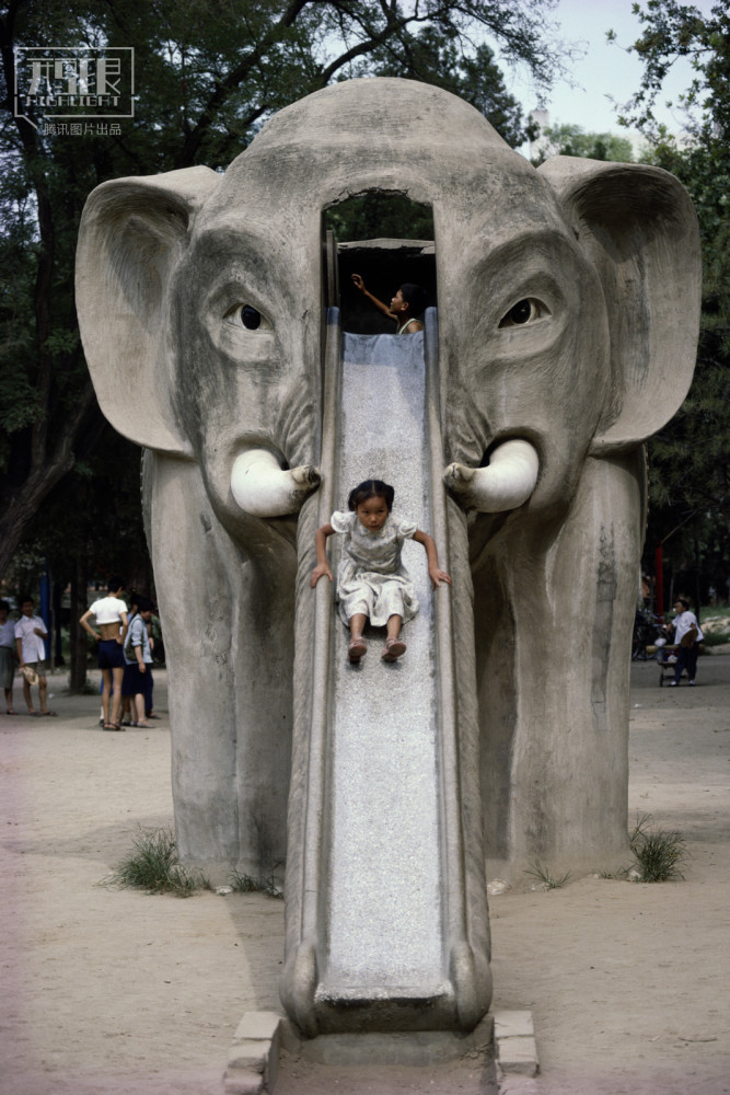 1987年,河南郑州,一个小女孩从大象滑梯上滑下来。