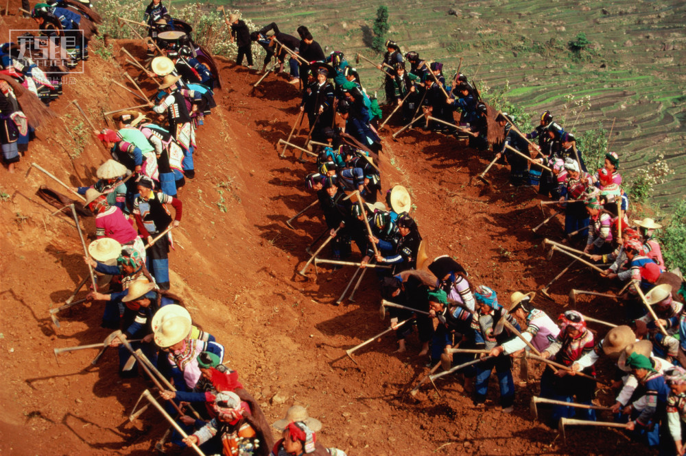 1993年,云南红河彝族自治州元阳县,春天,哈尼族与彝族的百姓**在一起,开垦新的梯田准备赠送给一对新婚夫妇。