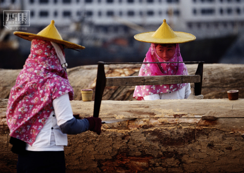1996年,福建泉州惠安县崇武镇,两位惠安妇女一起用锯锯木料。