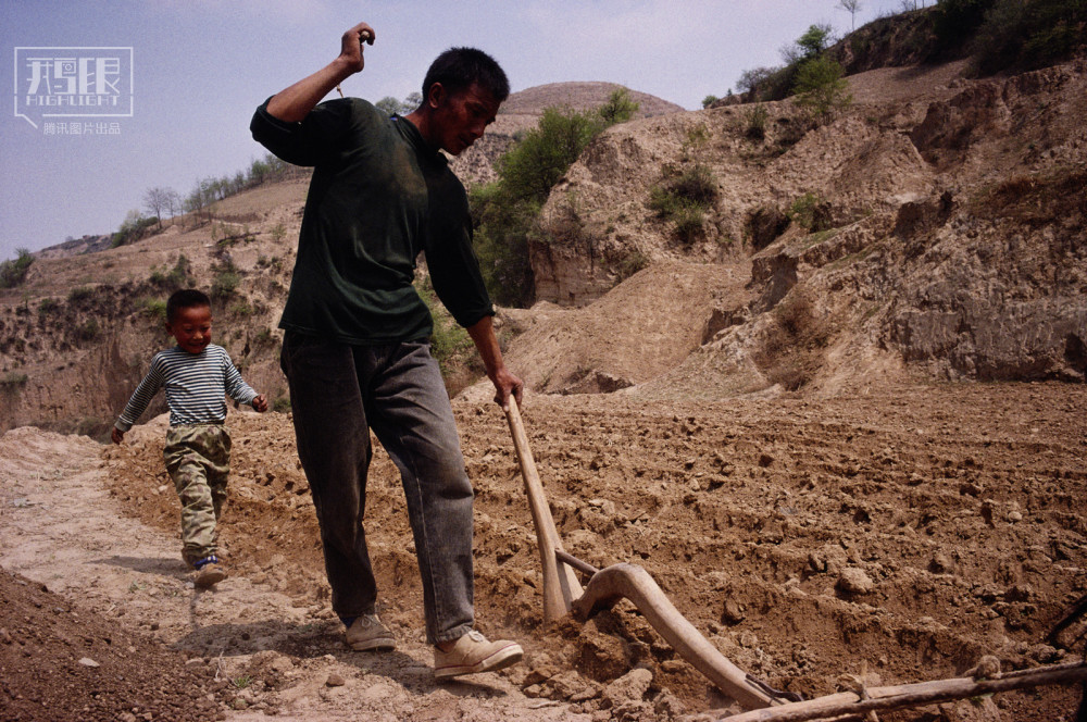 1998年,陕西,延安附近一个贫困的家庭正在用驴犁地。
