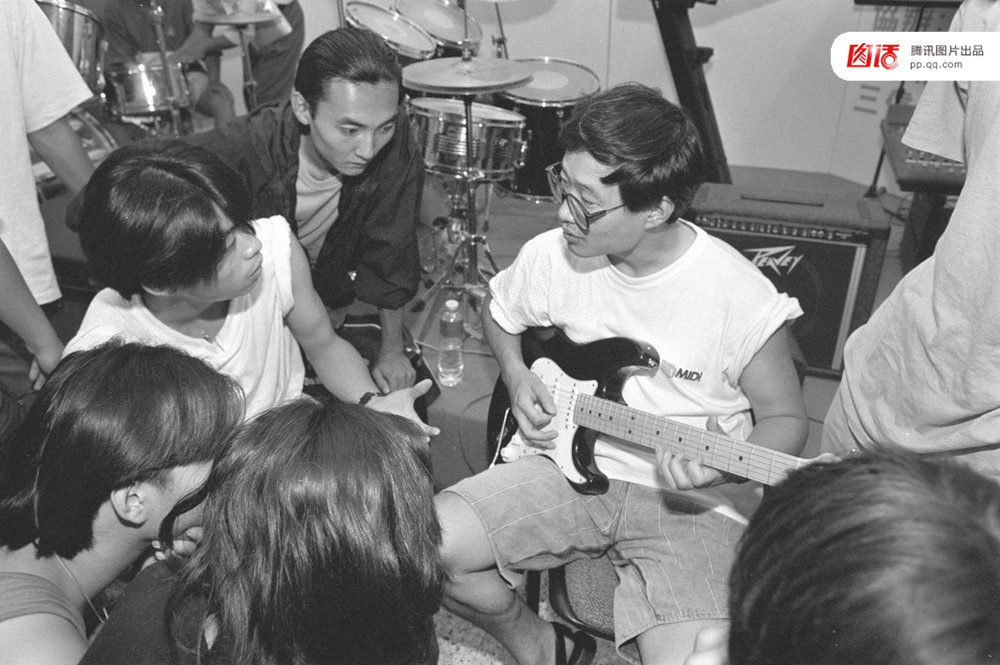 1993年,北京迷笛音乐学校摇滚乐教师曹平(持吉他者)在向学生授课。新华社记者曾璜摄