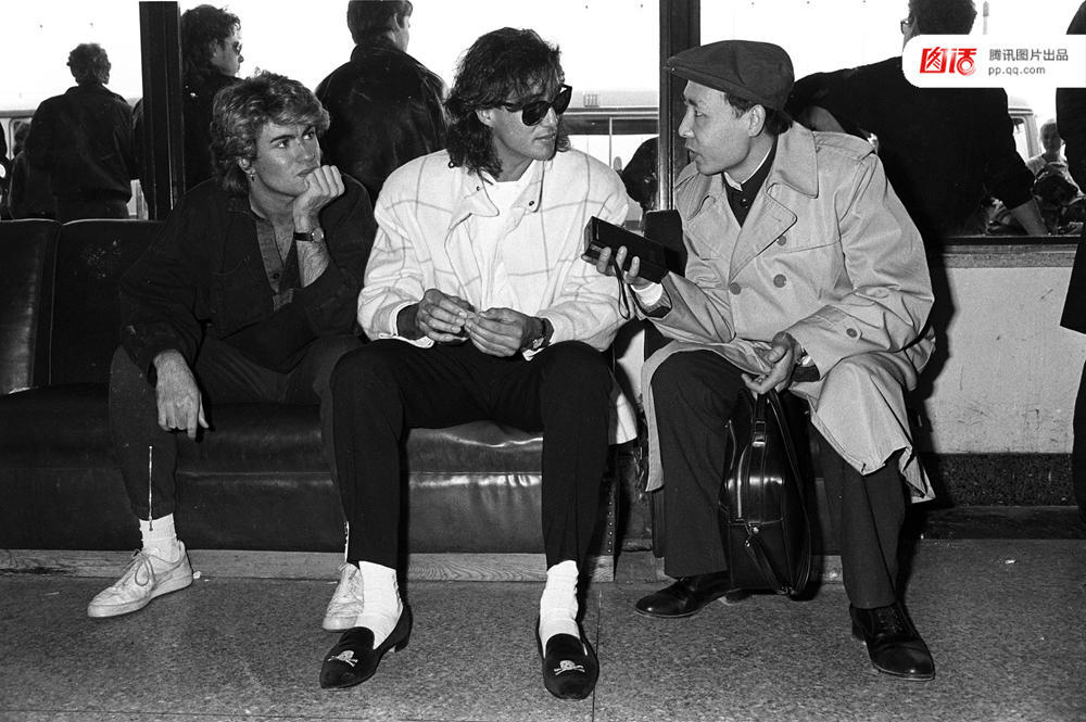 1985年,威猛乐队成员安德鲁·维治利和乔治·迈克尔在机场接受记者采访。图/视觉中国