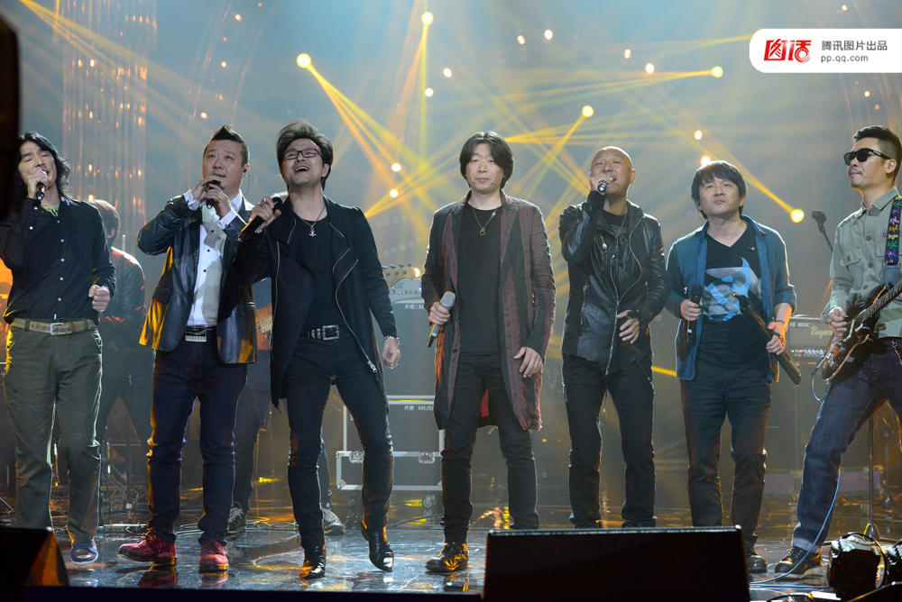 2016年4月8日,湖南卫视第四季《我是歌手》总决赛,汪峰、老狼、栾树、丁武、高旗、李延亮、周晓鸥、马上又、陈劲上台表演。图/东方IC