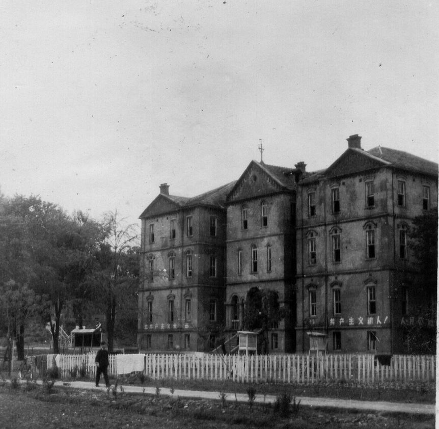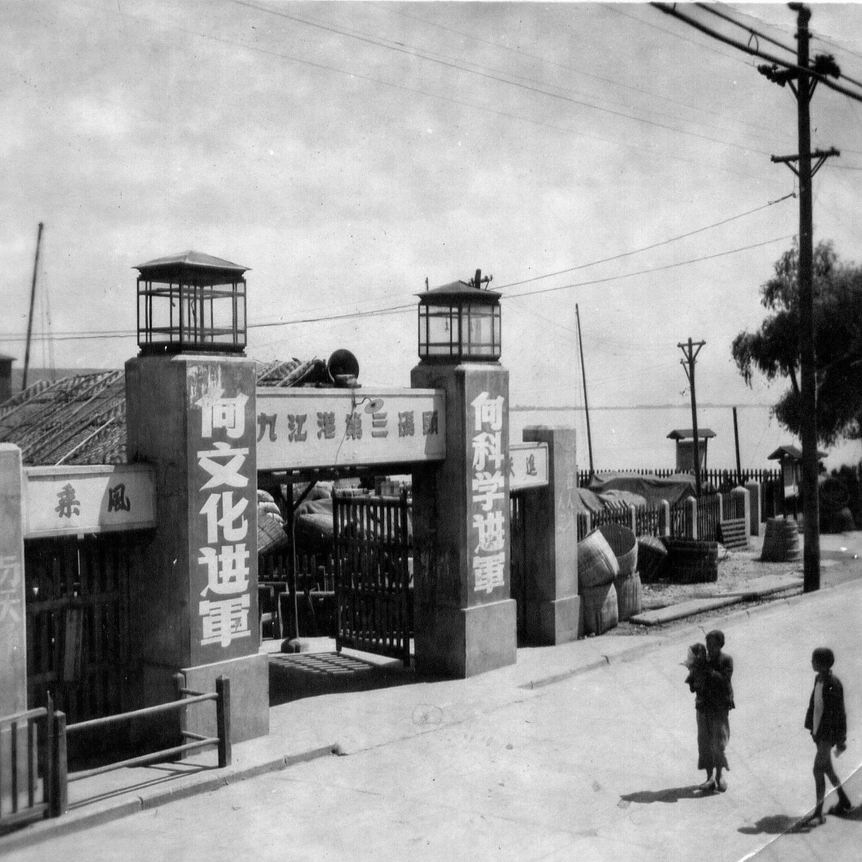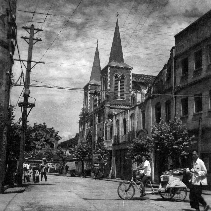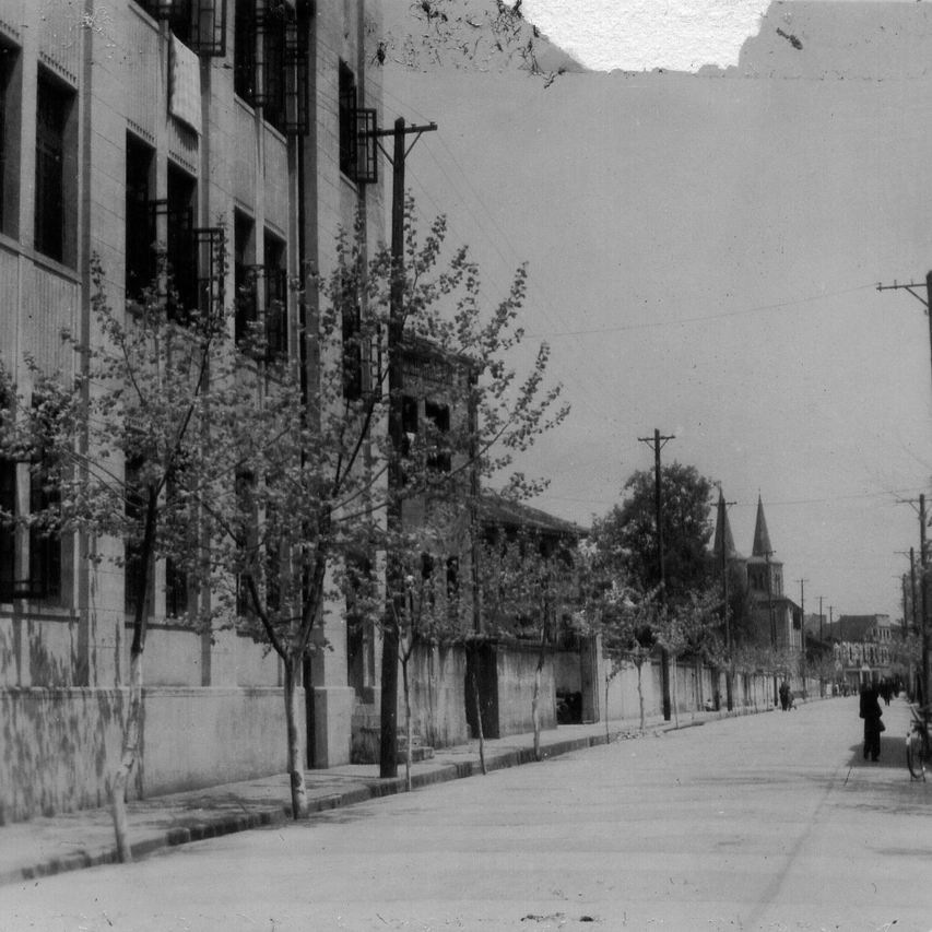 湓浦路街景,后面有城外天主教堂。其实这条路上海市有不少老建筑留了下来,就在现在的九江租界博物馆一带。院落内完好地保存了租界时期的原日本台湾银行旧址、英国亚细亚公寓旧址、日本领事馆旧址、日本领事馆公寓旧址等建筑物。
