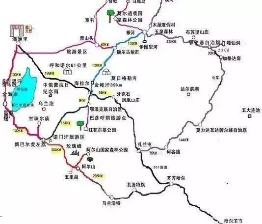 海拉尔——金帐汗——陈巴尔虎旗——莫尔格勒河——额尔古纳——根河湿地——恩和——室韦——临江——七卡——五卡——黑山头——满洲里——呼伦湖(金海岸)——贝尔湖——新巴尔虎右旗(西旗)——宝格德乌拉圣山祭祀——新巴尔虎左旗(东旗)——伊尔施——阿尔山——七仙湖——红花尔基——巴彦呼硕——海拉尔