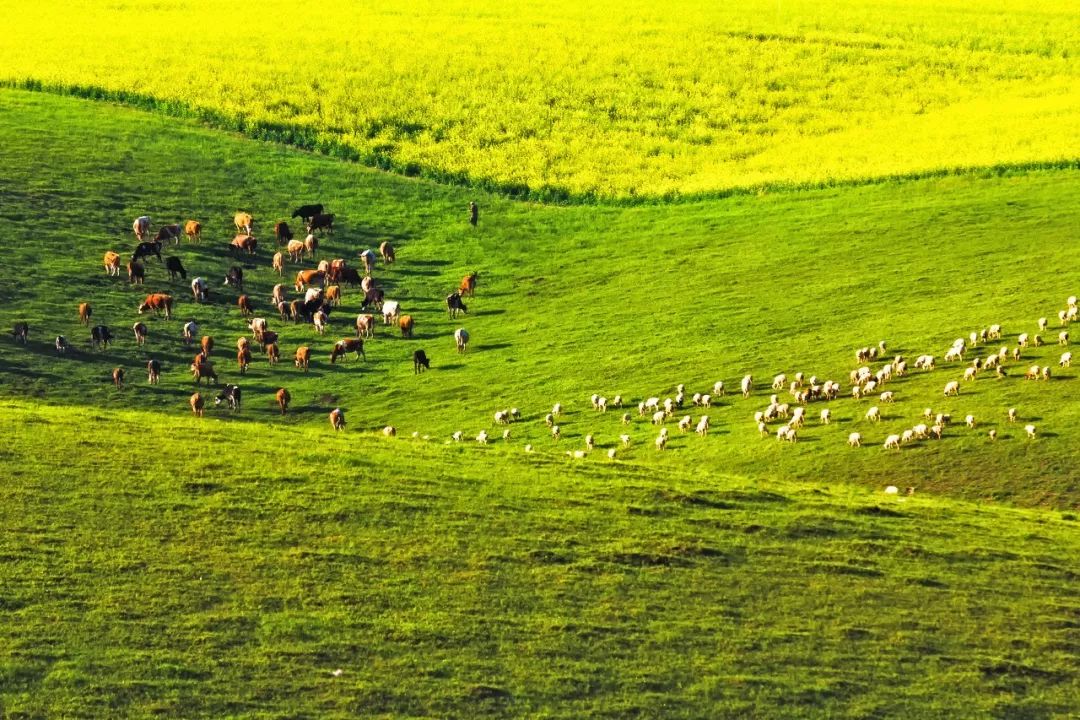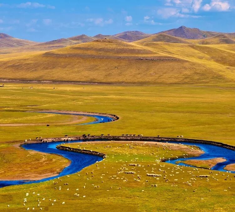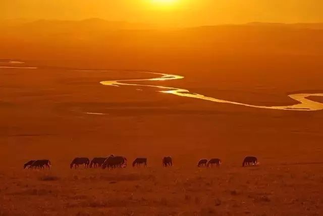 草原辽阔富饶、敖包山、蒙古包、牛羊......天然又和谐。