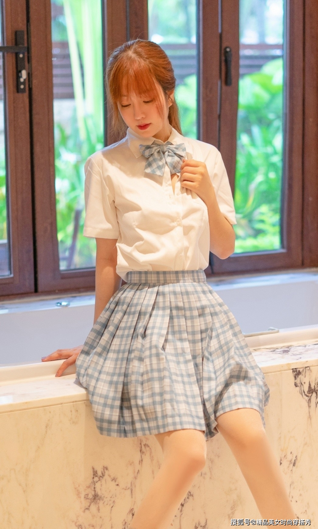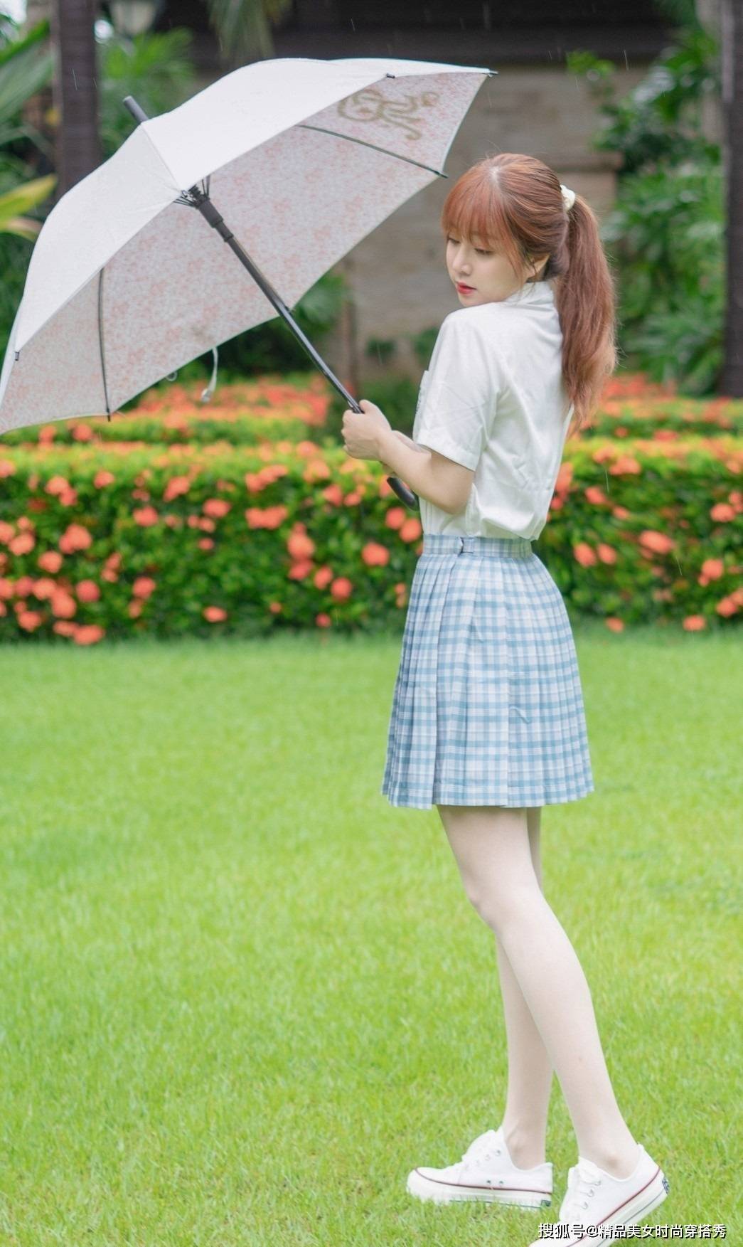 干练感十足的白色短袖衬衫,穿在身上干净又很衬肤色,领口用蓝色格子的蝴蝶结领结点缀,浪漫而不失俏皮感,下搭蓝色的格子百褶裙,淡蓝色与白色的拼接格子,在夏日里穿着清新感十足,高腰的褶皱版型轻松拉长腿部的线条美,搭配一双小白鞋,暑假出去玩或者是日常出街都OK。