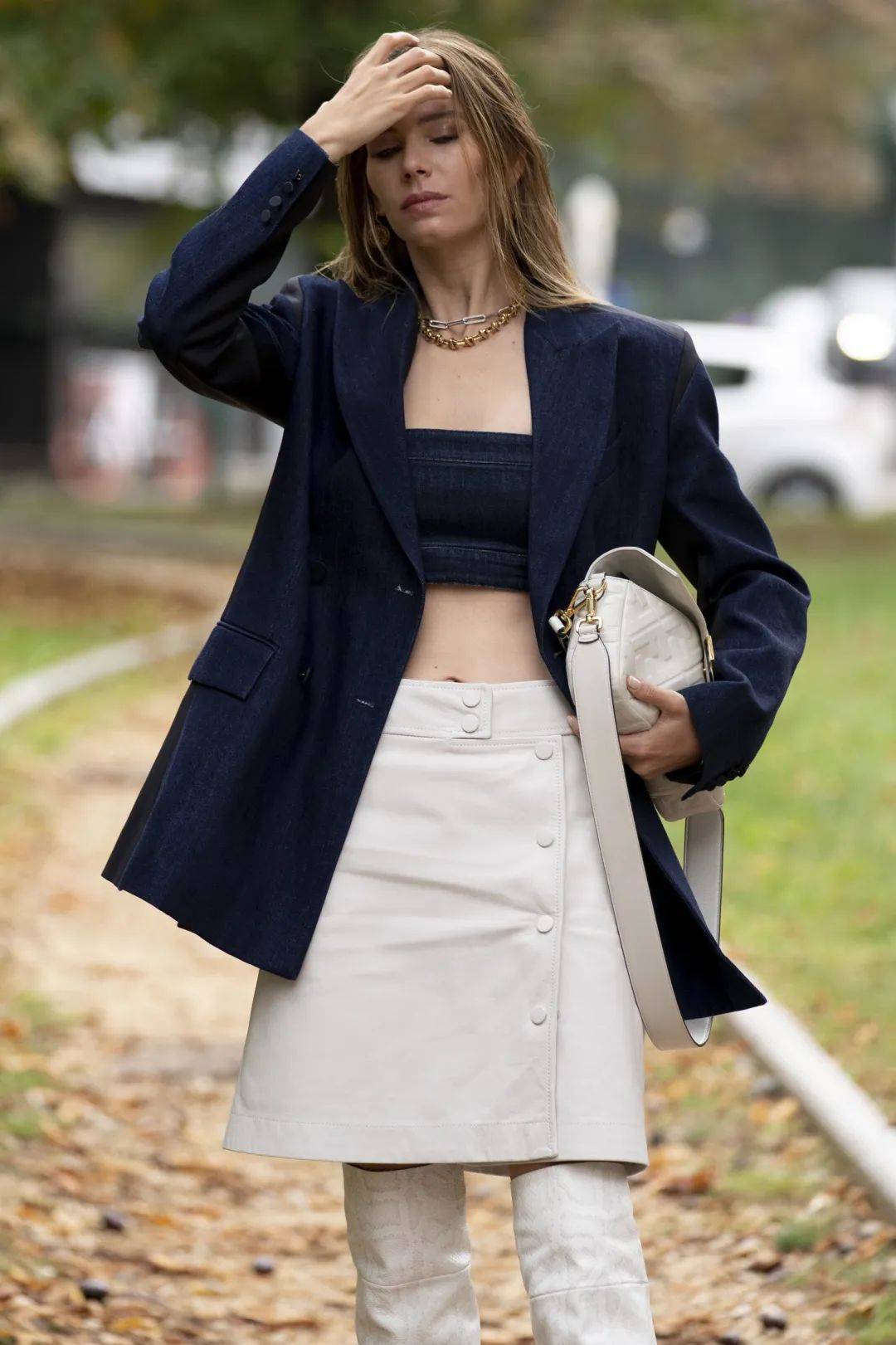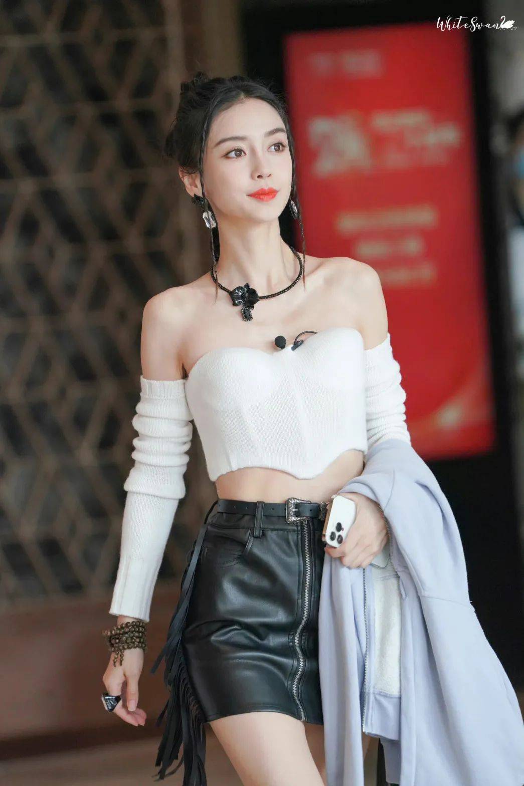 Angelababy白色鱼骨抹胸加上袖套演绎Y2K风格的精髓,硬朗的皮裙皮靴跳脱出常规甜美,黑色配饰增加反差,温柔清甜中透着小小叛逆。