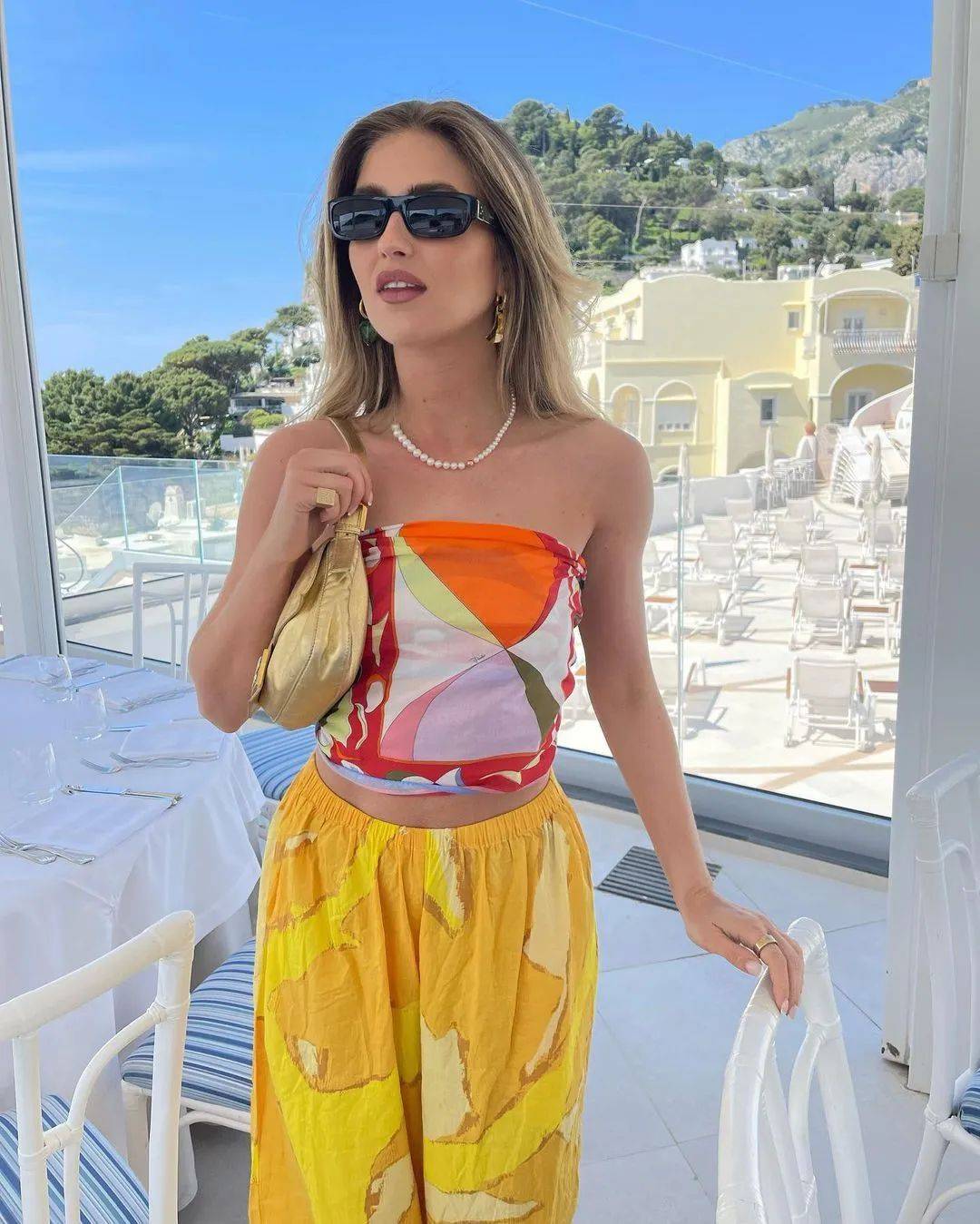 系包包绑手腕“浪费了”丝巾上的图案,做抹胸后彻底把印花摊开,热情的丝巾印花和裤装洋溢着缤纷的度假心情。